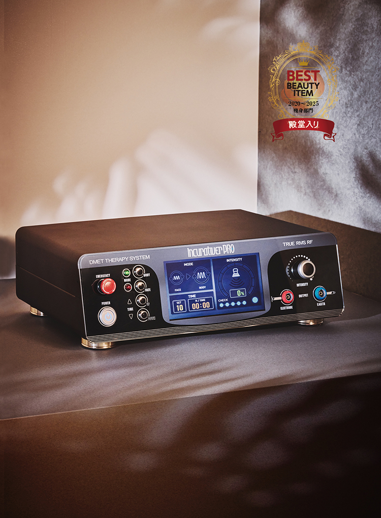 局所深部組織が40〜42℃の熱を発生させることができる性質を利用した深部加温システム「DMET THERAPY SYSTEM」を搭載した美容機器。安定した波形と周波数を維持できる点が高く評価されている。また、タッチパネル式で経験が浅くても操作しやすく、サロンの即戦力として導入されることも。包み込まれるような温感は、リラクゼーション効果が高いのもポイント。